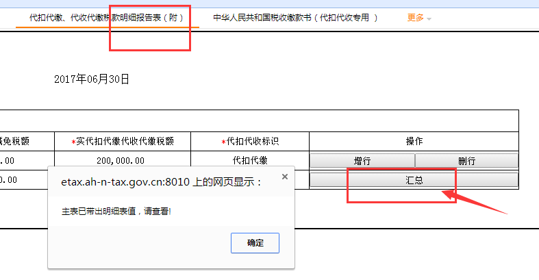 原因及解决方法:在代扣代缴附表中填写信息后,需要点击汇总按钮,提示:主表已带出明细表,请查看,就可以申报了。如图: