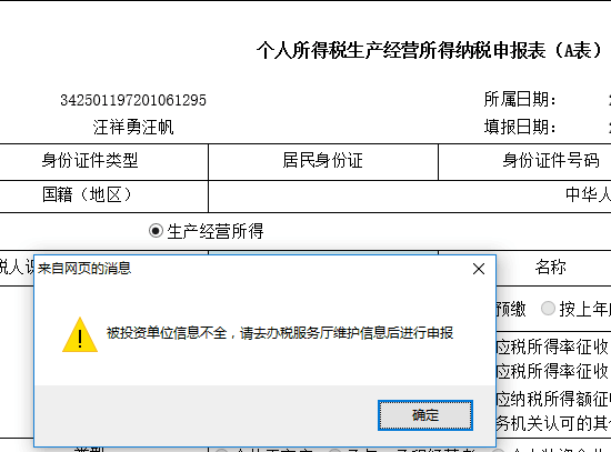 7、申报个人所得税a表,选择生产经营所得,提示:被投资单位信息不全,请去办税服务厅维护信息后进行申报。如何处理?