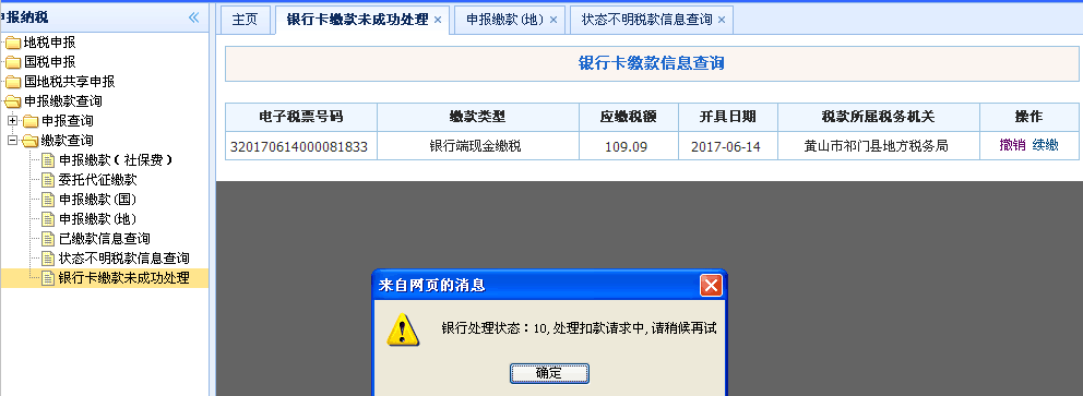 1、企业申报后误操作选择了银行卡扣款但扣款未成功,在银行卡缴款未成功处理菜单中点击撤销提示“银行处理状态:10,处理扣款请求中,请稍后再试”,如何处理?