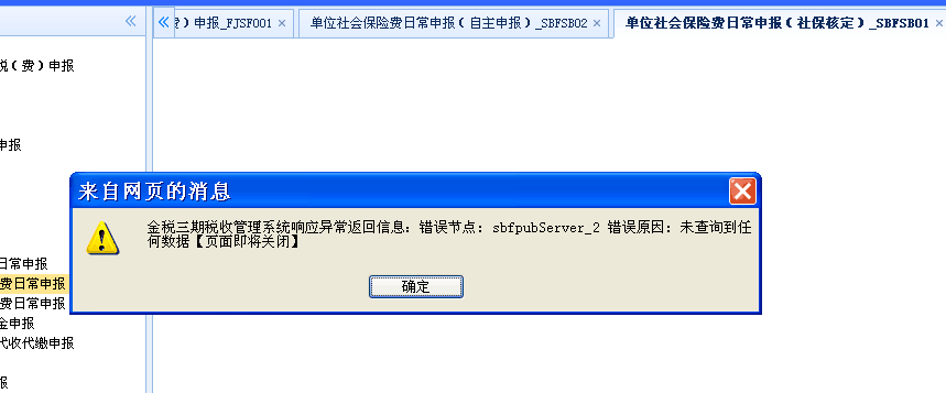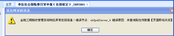 2、申报社保费时提示:未查询到任何数据[页面即将关闭],如何处理?