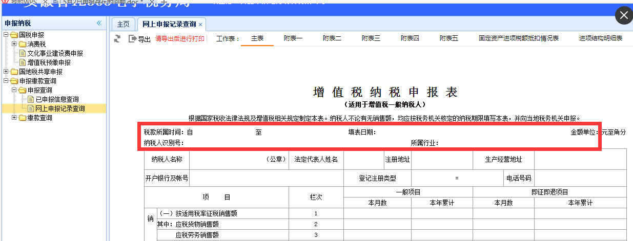 7、申报增值税申报表后在点击网上申报记录查询查看报表,报表表头企业信息和所属期都是空的,数据也是空的。