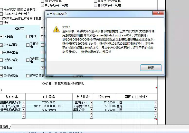 原因及解决方法:企业的投资方纳税人识别号在纳税人登记信息表中登记的是91开头的税号,但在对外投资情况信息表中,纳税人识别号是34开头的,这两个表中登记的企业税号必须统一,需要去大厅更正。在平台也可以看到,自然人登陆后,在【税务登记】-【自然人变更】-【自然人投资信息】中查看是否一致。