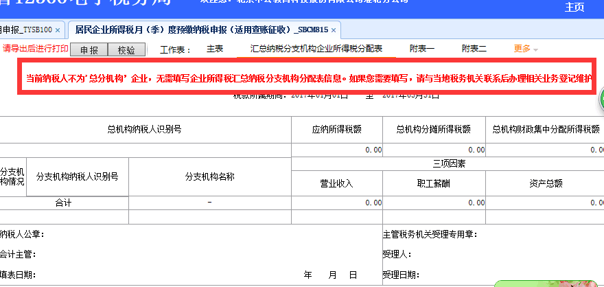 7、企业是分支机构企业,在平台地税模块申报企业所得税,打开报表后,所得税分配表无法填写,表头提示“当前纳税人不为总分机构企业,无需填写企业所得税汇总纳税分支机构分配表信息,如果您需要填写,请与当地税务机关联系后办理相关业务登记维护”,如图: